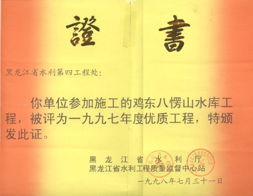 雞東八楞山水庫優(yōu)質(zhì)獎證
